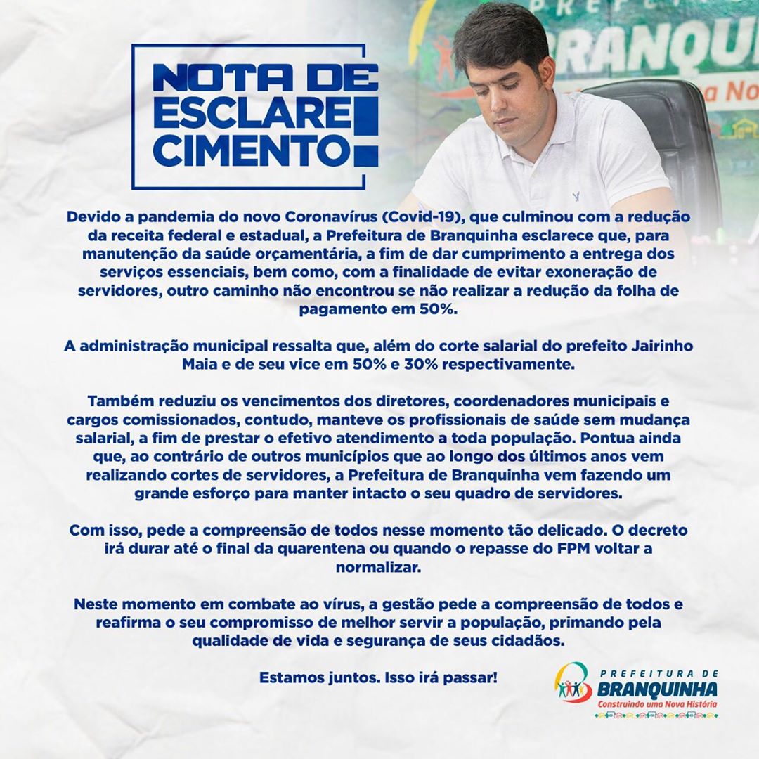 O prefeito do município de Branquinha, Jairinho Maia (PP), reduziu em 50% o salário de todos os servidores públicos do município. Embora polêmica, a medida agradou ao deputado Davi Maia, que elogiou a ação do prefeito.