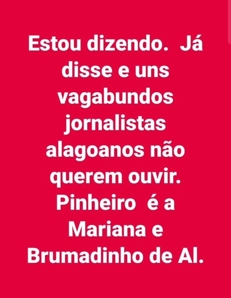 Na postagem, o procurador refere-se aos jornalistas alagoanos como ‘vagabundos’. “Estou dizendo. Já disse e os vagabundos dos jornalistas alagoanos não querem ouvir. Pinheiro é a Mariana e Brumadinho de AL”, afirmou Guedes, em seu perfil, no Facebook.