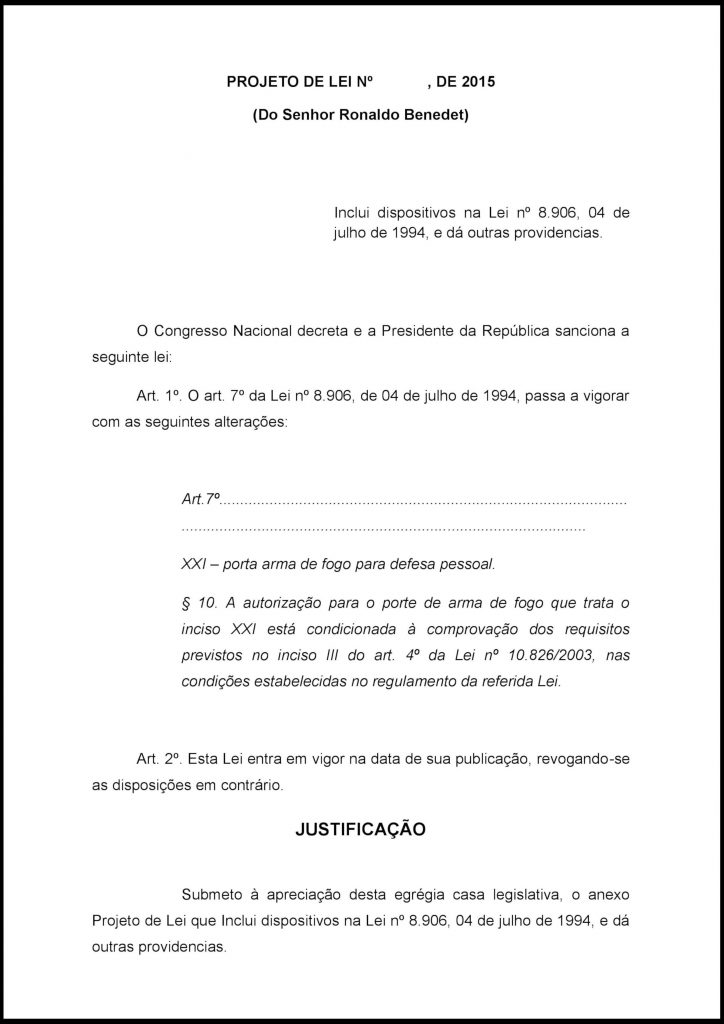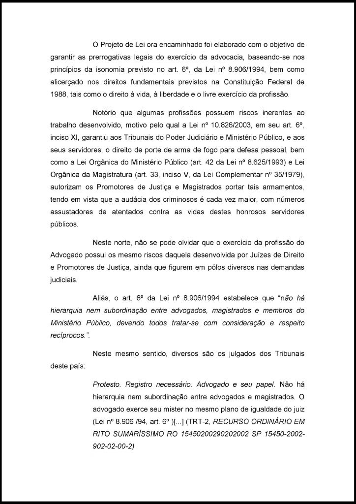 Esse projeto tem o intuito de dar o direito aos advogados, que cumprirem os respectivos requisitos apresentados na PL, de terem os mesmos direitos que são reservados apenas aos Magistrados e Procuradores quanto ao porte de armas, como também os dá o direito de adquirir armas de calibre restrito.