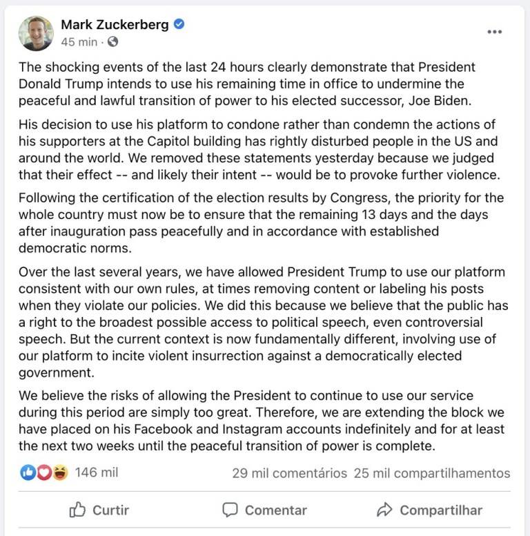 “Acreditamos que os riscos de permitir que o Presidente continue usando os nossos serviços durante esse período são simplesmente muito grandes”, disse Zuckerberg.