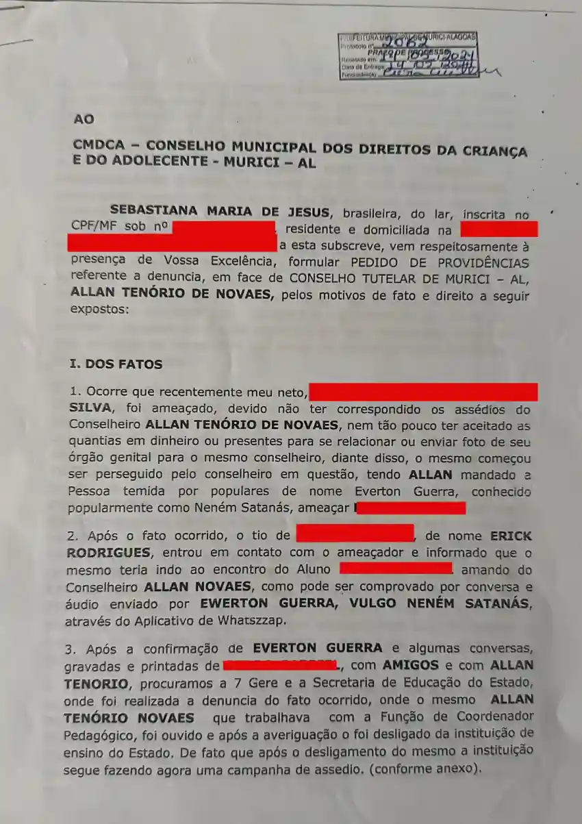 Uma série de documentos, incluindo boletins de ocorrência e depoimentos, revelam uma grave denúncia de assédio contra Allan Tenório de Novaes, conselheiro tutelar em Murici. Sebastiana Maria de Jesus, avó da vítima, acusa o conselheiro de assediar e ameaçar seu neto de 17 anos.