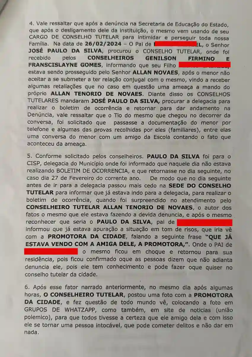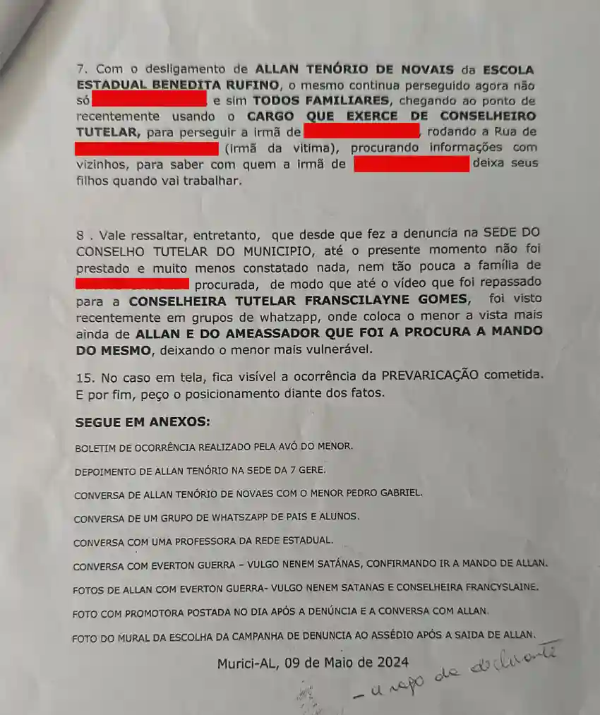 Mesmo após ser desligado de suas funções na escola onde trabalhava, Allan Tenório continuou a perseguir a vítima e seus familiares. Documentos anexados à denúncia mostram que o conselheiro estava utilizando seu cargo para intimidar e ameaçar a família do jovem.