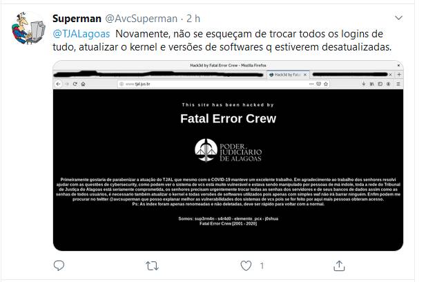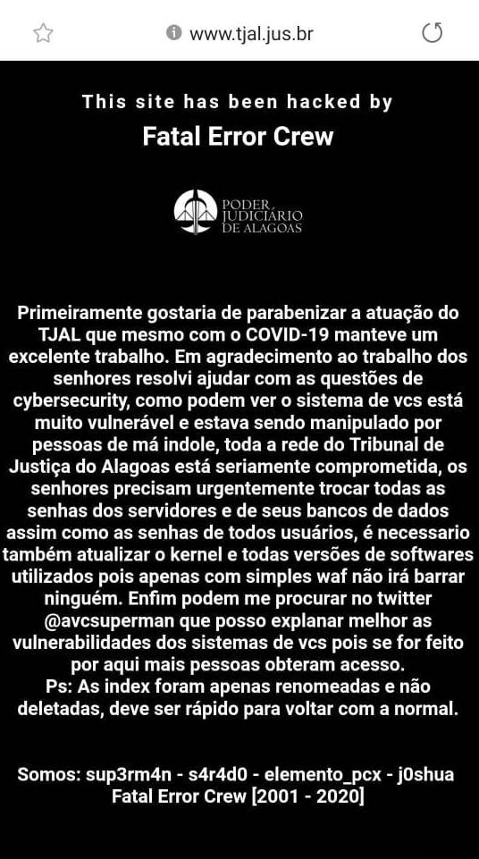 Ao acessar a página, aparecia uma mensagem endereçada ao próprio TJ/AL, alertando que todo o sistema do tribunal de Justiça está vulnerável, e orientando que todas as senhas sejam trocadas.