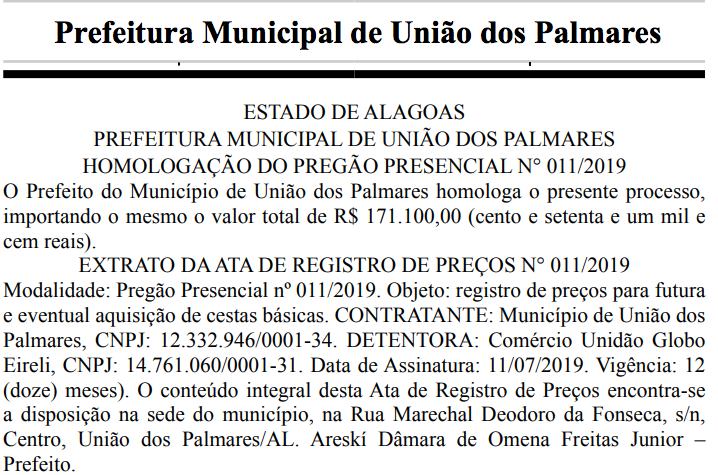 Em julho de 2019, o prefeito Areski Freitas homologou um contrato de licitação no valor de R$171.100,00 (Cento e setenta e um mil e cem reais), em que a prefeitura contrataria o Unidão Globo para o fornecimento de cestas básicas.