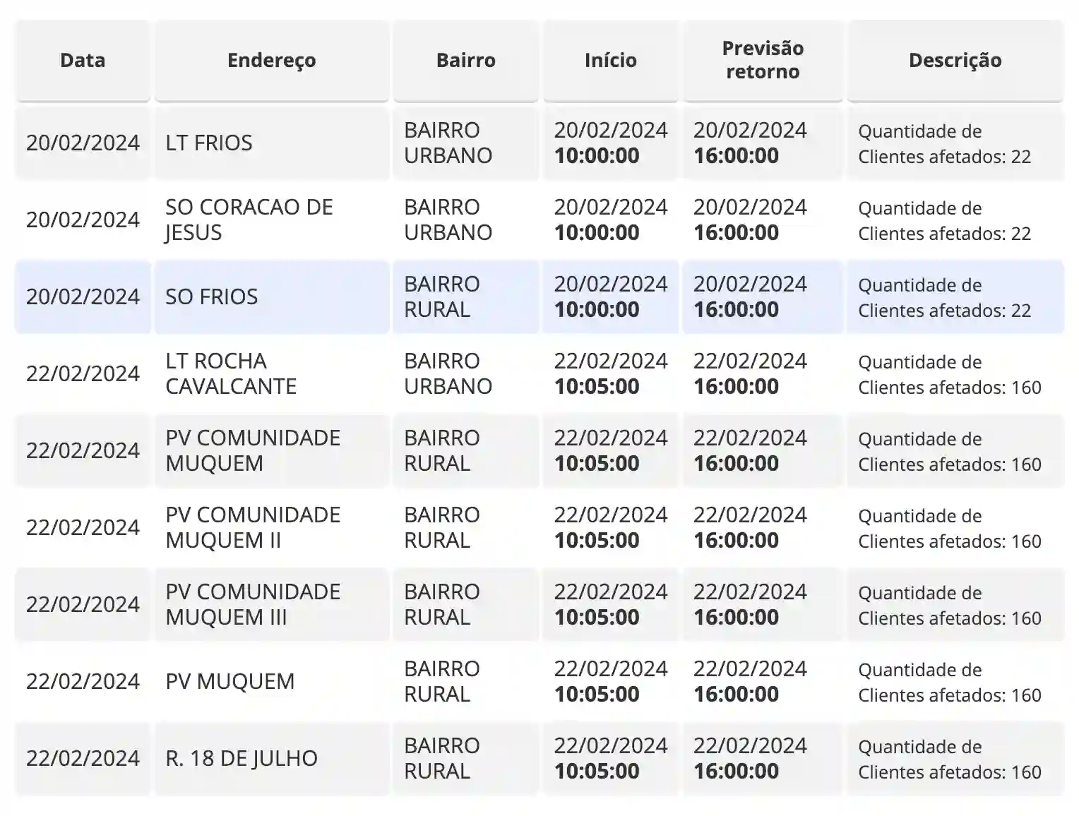 O desligamento está programado para ocorrer em diversos bairros, tanto urbanos quanto rurais, em datas específicas. Segundo a programação divulgada pela empresa, o desligamento afetará um número determinado de clientes em cada região.